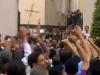 تعليق من الموقع : فى حدث فريد من نوعه بتصفيق الرجال وتهليلهم وزغاريد النساء أعلن الأقباط عن شعورهم بوصول الأبطال إلى حضن كنيستهم لتنسم الرب رائحة رضا من أجل أبناءه الذين أستشهدوا وهم يحملون أسمه المسيح الأسم العظيم "مسيحيين" هم الأبطال الأبرار الذين ضحوا بحياتهم لأنهم وقفوا أمام كنيسة مار مينا بإميابة فى 75/2011م أمام جحافل المسلمين الشرسة التى تقتحم كنيستهم والذى أسمهم على أسم نبيهم "محمديين" وتعالت هتافات الأقباط أثناء دخول الجثامين ألأربعة من الشهداء داخل الكنيسة وهم يقولون بالروح والدم نفديك يا صليب وكما يقول الإنجيل كلمة الصليب عند الهالكين جهالة أما عندنا نحن فهى قوة الرب الإله كما تسابق الأقباط ليلمسوا الصناديق بركة من شهداء ضحوا بحياتهم لأنهم مسيحيين وقفوا فى بسالة أمام الإرهاب الإسلامى الإجرامى الذى يريد أن يقتحم كنيستهم أذكرونى أيها الأبطال الشهداء أمام عرش النعمةرأيت تحت المذبح نفوس الذين قتلوا من أجل كلمة الإله ومن أجل الشهادة (رؤ 6: 9 ) تهديد بحرق كنيسة مار مرقس بالجيزة (المطرانية التى تم بداخلها صلاة الجناز لشهداء كنيسة مارمينا بإمبابة) الأقباط دوت كوم 11/5/2011م قام خالد خليل نسيم محامي كنيسة مارمرقس الجيزة بتفويض من القمص مرقص جورج والقمص بنيامين مرجان راعيا الكنيسة مارمرقس الجيزة بإبلاغ المنطقة العسكرية بالهرم عن تلقي الكنيسة تهديدات بالحرق من قبل بعض المتطرفين، جاءت التهديدات عن طريق ملصقات على حائط الكنيسة والمباني المجاورة لها. *********************** مشاهد من فيديو عمرو اديب وتشيع جنازة شهداء كنيسة مارمينا امبابة 2011 من كنيسة مطرانية الجيزة بشارع مراد **********************************************************************************************************************