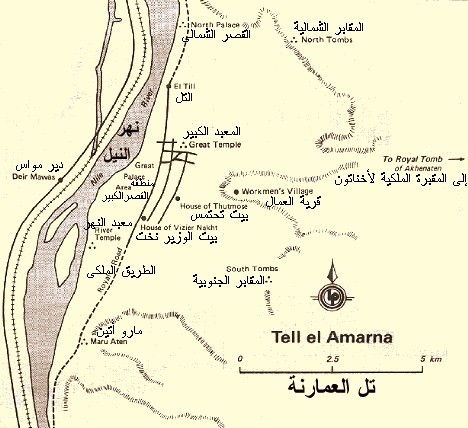 تل العمارنة اسمها الفرعونى "أخـِت أتون" وتعنى "أفق أتون" وهي عاصمة جديدة لمصر بناها اخناتون حوالى سنة 1365 قبل الميلاد فى البر الشرقى لـ النيل بينما حفر المقابر فى البر الغربى للنيل هذه العاصمة أنشأها الملك إخناتون كمقر لديانته الجديده بعبادة الشمس مصدر الحياة وبنى فيها سرايات ملكيه ومعابد وبيوت لرجاله ، وتقع على بعد خمسة وأربعين كم جنوب مقابر بني حسن بمحافظة المنيا - ولم تستمر تل العمارنة عاصمة لمصر لمدة طويلة بعد بنائها فى عصر اخناتون وخليفته سمنخ كارع لإن توت عنخ امون هجرها وذهب إلى طيبه العاصمه القديمه. ومقابر "تل العمارنة" تحتوى على مجموعتين من المقابر المبنية فى الجرف 1 - مجموعة شمالية وتقع عند الطرف الشمالى للمدينة 2 - مجموعة جنوبية عند الطرف الجنوبى للمدينة. وتتميز هذه المقابر بلوحاتها الحائطية الملونة التى تصور الحياة أثناء ثورة "أتين" الدينية. وكان أخناتون قد أعد مقبرة لنفسه ولكن لأمر لم يفسره المؤرخون لم يتم دفن "أخناتون" فى هذه المقبرة، كما لم يتم العثور على مقبرة أخرى تحمل اسمه وتقع مقبرة "أخناتون" الملكية فى واد ضيق صغير، على بعد حوالى 6 كم من الوادى الكبير الذى يفصل بين المقاطع الشمالية والجنوبية للأجرف. كما لم يتمكن المؤرخون من سبب إهمال هذه المدينة هل هو تم بناء على أوامر ملكية أو نتيجة لمرض تفشى أو أو بسبب هجرة ساكنى المدينة أو بسبب آخر ، وعموماً فإن العديد من هذه المقابر لم يتم استكمالها وتركت ناقصة ، ونسبة قليلة جداً منها هى التى تم استخدامها بالفعل. ويضم المتحف المصري نماذج جميلة من غطاء أرضي من الجص، والذي كان مصدره هذه المساكن. يوجد 25 مقبرة قطعت فى قاعدة الأجرف، مرقمة من 1 إلى 6 فى الشمال، ومن 7 إلى 25 فى الجنوب. والمقابر التى يمكن للسياح زيارتها هى: |