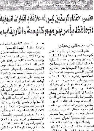 تعليق من الموقع : التفاوض مع المسلمين هو التفاوض مع الشيطان فقد لوحظ أن الكهنة الذين عندهم موهبة إخراج الشياطين عندما يخرجون شيطان من على أحر الأشخاص يفاوضهم الشيطان ويقول هاخرج من عينه حتى يفقد عين الشخص هاخرج من رجله حتى يشل الرجل .. إن كل تفاوض من المسلمين يسبب ضرراً للأقباط - تنازل الأقباط عن حقوقهم الوطنية هو تنازل مهين ومذل وسيتمادى المسلمين فى فرضة على باقى الكنائس فى مصر**************************************************************************************************