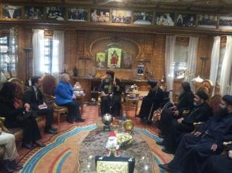 +++ غى 9/1/2013م قام وفد من قيادات الكنيسة القبطية الأرثوذكسية صباح الأربعاء 9 يناير بزيارة مقر الطائفة الإنجيلية بمصر الجديدة للتهنئة بعيد الميلاد ضم الوفد الأنبا موسى والأنبا مرقس والأنبا كيرلس والقمص سرجيوس والأستاذ جرجس صالح وكان في استقبالهم الدكتور القس صفوت البياضي رئيس الطائفة الإنجيلية والدكتور القس جورج شاكر سكرتير الطائفة والقس أيمن منير عضو المجلس الملي والقس عزت شاكر رئيس الإدارة المالية بسنودس النيل الإنجيلي والقس رفعت فكري رئيس مجلس الإعلام والنشر بالكنيسة الإنجيلية واعتبر القس رفعت فكرى رئيس مجلس الإعلام والنشر بالكنيسة الإنجيلية زياردة وفد الكنيسة الأرثوذكسية صورة جميلة مشرفة لوحدة الكنيسة من جانبه وصف الدكتور القس اندريا ذكى نائب رئيس الطائفة الانجيلية انها زيارة ايجابية للغاية باعتبارها المرة الأولى فى التاريخ الحديث يأتى وفد من الكنيسة الارثوذكسية لتهنئة الكنيسة الانجيلية فى مقر الطائفة الانجيلية الرسمى واحدى العلامات الجديدة للبطريرك البابا الجديد مقدما شكره للبابا واكد القس اندريا على ان وحدة المسيحيين على مستوى الشعب والقيادات الدينية ضرورية فى اللحظة الراهنة داعيا الى الحورا المسيحى-المسيحى ولفت القس اندريا انه اثناء زيارة الوفد الانجيلى لقداسة البابا فى الكتدرائية يوم الجمعة الماضى للتهنئة بالعيد تتطرق الحوار لاهمية شهادة الكنيسة بشكل عام فى اللحظة الراهنة وهذا التبادل يسعى نحو ترشيغ الارضية المشتركة بين الكنائس وحول انشاء مجلس الكنائس المصرية قال نائب رئيس الطائفة الانجيلية أن البابا يقرأ اوراق تأسيس مجلس للكنائس المصرية وبمجرد انتهاءه منها سنعقد اجتماع لنستفيد من كل ملاحظات الكنائس وفى ضوء هذه الملاحظات سيعلن عن انشاء مجلس الكنائس المصرية رسمي