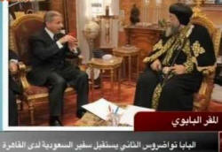 +++ فى 15/2/2013م السفير السعودى : بحثنا مع البابا تواضروس التعاون بين الكنيسة الأرثوذكسية والمملكة العربية السعودية : قال السفير السعودى بالقاهرة أحمد القطان إن نحو ألف مصرى محتجزين بالسجون السعودية بينهم 28 فقط صدرت بحقهم أحكام وأضاف القطان عقب لقائه البابا تواضروس الثانى بالمقر البابوى أن "اللقاء كان مثمرا ودعوت البابا للمشاركة فى مبادرة العاهل السعودى الملك عبدالله بن عبدالعزيز للحوار بين الأديان التى تقام فى فيينا" وقال القطان فى تصريحات عقب اللقاء، «هنأت البابا بالمنصب البابوى، وتمنيت له التوفيق والسداد، واللقاء كان ممتعا تعرفت من خلاله إلى هذا الرجل القدير» وبسؤاله عن عدم السماح ببناء كنائس بالسعودية قال قطان: "لا يجوز بناء كنائس بالمملكة السعودية فهى كالفاتيكان لكننا نحترم كل أصحاب الديانات".