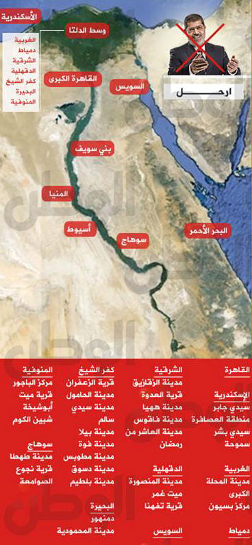 ومن المتوقع أن تشهد السويس والمنوفية والشرقية (مسقط رأس الرئيس مرسي) مسيرات معارضة للرئيس مرسي.