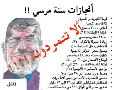 ولكنها لم تكن هبات خيرية بل استثمارا والتى أصبحت وسيلة للضغط من أجر شراء مصر وكان القطريون قد ضمنوا صفقة مربحة لبيع الغاز الى مصريين كما اقترحوا توظيف استثمارات كبيرة لإعادة تطوير قناة السويس والإستيلاء على ملكيتها لمدة 99 عاماً ولكن فشل مرسي وانتقل من فشل إلى آخر فلم يحقق أي انتعاش اقتصادي وعد به وزادت صلافته وكبرياؤة وإعتماده على أوامر المرشد من جهة والوعود الأمريكية من الجهة الأخرى حتى إنتهى الأمر به ففقد مرسي كرسيّه الرئاسي وإختفى فى غياهب السجون التى هرب منها وترك القطريين منهمكين في محاولة احتواء الضرر وترك أوباما أيضا يحاول أن يبرر مساندته لتنظيم الإخوان المسلمين الإرهابى أمام الكونجرس والشعب الأمريكى ةلم يعرف بعد لماذ سلك أوباما هذا الطريق المخالف لسياسته السابقة وليس لهذا إلا تعليلا واحده أنه حدث إختراق من تنظيم الإخوان المسلمين الإرهابى للبيت الأبيض (يقال أنه وصل عددهم إلى 12 مسلما إخوانيا) بحيث قدموا له توصيات ومعلومات إتخذ على أثرها سياسته التى أدت بمصر إلى هذا الإنقسام والتأخر والشئ الذى لا يمكن تفسيره أن الأمريكان قاسوا الويلات من تنظيمات الإرهاب الإسلامى فأنشأوهم فى أفغانستان للقضاء على الدب الروسى ثم مالبث أن إنقلب السحر (منظمات الإرهاب الإسلامى) على الساحر الأمريكى وشاهدنا برجى التجارة العالمى ينهار أما مرسى فقد فتح السجون لعصابات الإسلامى من القتلة ليخرجون أحرارا فى المجتمع المصرى ولم يتوقف عند هذا الحد فإنه طلب من الرئيس أوباما إطلاق الإرهابى مخطط تفجيرات برجى التجارة عمر عبد الرحمن حرا ثم بدأ الساحر الأمريكى يلعب لعبة أخرى وهى إنشاء سحر مكون من الإخوان المسلمين فى مصر هذا السحر إنقلب على المصريين ولم يجد الوقت الكافى لينقلب على الأمريكان إلا أن آثار هذا شر سحر الإخوان اصاب الرئيس الأمريكى بعدم الإتزان فرأينا وجهه يتجهم فى الصور المختلفة التى تنشر له وأريد أن يحل لى أمريكى واحد هذا اللغز : لماذا يحارب الأمريكان إرهاب عصابات الإسلام فى أفغنستان ويساعدوهم فى مصر ويؤيدوهم فى سوريا؟ وكيف يتركون علم القاعدة يرفرف فى سيناء ويعمل بحرية مع حركة حماس الإخوانية؟والأمر الآخر أن أوباما قطع المساعدات عن مصر بضغط من الكونجرس الأمريكى وقلت مساعدات الدول الأخرى والتى وعد مرسى بأنها ستكون عشرات المليارات وفقد مرسى عصا الدعم العالمى المالى السحرية والتى أعتمد عليها بالحلول لمشكلات مصر وأصبح شعارهم الإسلام هو الحل بدون قيمه بعد قطع المساعدات ولما لم يكن للإٌسلاميين بروجرام لقيادة البلاد وعندهم فقط أجندة داخلية يريدون تطبيقها فوضعوا دستورا لا توجد فيه ماده خارجة عن الشريعة الإسلامية وسارعوا باخوانة الدولة أى إحلال الإخوان فى جميع الوظائف الحكومية كما حاولوا اخونة الجيش والأزهر وقد لاقى معارضة شديدة من الجيش وأدى إلى القطيعة بين شيخ ألأزهر ومرسى وبالنسبة للمسيحيين الأقباط فقد شجع الإخوان الرعاع للهجوم على الكاتدرائية كما أن الإضطهادات اليومية التى واجهها الأقباط فى الستة شهور الأخيرة زادت فى كميتها عن كمية الإضطهادات لعدة سنين مما قابله الأقباط فى عهد مبارك وحدثت معاناة يومية للمواطن فى الحصول على العيش والبترول وإنقطاع الكهرباء والماء وزادت الأسعار والمشكلات الأخرى ودخلت البلاد فى نفق ألإنهيار الإقتصادى المظلم فضج الشعب مما أدى إلى إستحالة إستمرار مرسى فى الحكم كما أنه فى الواقع لم يكن رئيسا يفخر به المصريين شكلا وموضوعاً فهو تابع لجماعة أى فرد فيها يأتمر بأمر المرشد أى أن مرشد الجماعة يصدر الأوامر وعلى الجميع الطاعة أى المرشد هو الرئيس وليس مرسى لأنه يوجهه كالدمية لهذا هتف المصريون يسقط يسقط حكم المرشد بدلا من يسقط الرئيس وعن شرعية صناديق الإنتخابات رأى شعب مصر خروج صناديق جثث معارضى الأخوان الذين خطفوهم وعذبوهم وقتلوهم ورأينا عندما كان أهل بورسعيد يشيعون جثث موتاهم أن أستعان الإخوان بالقناصة لضرب المشيعيين فسقطت الجثث من ا