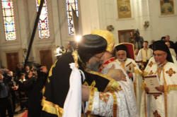 البابا تواضروس: جئنا لنقدم التهنئة والمحبة لبطريرك الكاثوليك "ويهديه أيقونة العذراء" الأقباط متحدون الثلاثاء ١٢ مارس ٢٠١٣ - كتب: جرجس توفيق قال البابا توا ضروس بابا الإسكندرية وبطريرك الكرازة المرقصية أن احتفال تجليس الأنبا إبراهيم ساحق بطريركًا للكاثوليك، هو يوم فرح بأن تختار الكنيسة بطريركها ليكتمل العمل الكنسي . وأضاف البابا في كلمته إبان حفل التجليس "جئنا لتقديم التهنئة للكنيسة الكاثوليكية ونقدم المحبة لغبطة البطريرك الأنبا إبراهيم اسحق ". وقال البابا أن الأب البطريرك هو أب قبل أي شيء باعتباره يحمل الأبوة تجاه كل أحد ،وأشار البابا إلى أن العالم الآن جائع للمحبة الحقيقية ،مؤكدا أن عمل المحبة يمتد لكل إنسان . وألمح أن الأمر الثالث لـ" الأب البطريرك "هو الخدمة،والخدمة تمتد لكل إنسان . وأشار إلى أن فرح هذا اليوم فرح كبير ،لأن الكنيسة المحبة للمسيح اختارت هذا البطريرك الذي أسمع عنه وعن محبته من الآباء في المنيا. وأردف قائلا" باسم الأساقفة وكل الكنيسة القبطية نقدم تهنئتنا لآخونا الحبيب غبطة البطريرك الأنبا إبراهيم ،وننتهز كل فرصة لكي نؤكدها ونعمل معا في خدمة الوطن والكنيسة ونقدم له هدية أيقونة العذراء.