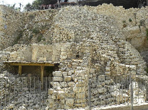 الصورة الجانبية : منظر لهيكل الحجر المتدرج المتاخم لجدار قصر داود الشرقي. نموذج يقف على امتداد جدار بسمك 19 قدمًا. تم بناء سور نحميا على قمة الجدار القديم ، ويمكن رؤية برج ، يعود أيضًا إلى فترة نحميا ، في المقدمة.