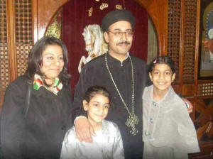 أسرته & يوستينا إبنة الشهيد تقبل جثمان والدها بعد الصلاة علية ويلاحظ أن نصف وجهه كان مغطى بضمادات من الشاش الطبى لإخفاء ضربات الرصاص الإسلامى الغادر