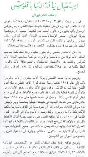 25/10/2014م عااااااااااجل : اول مشلكة للانبا بافلوس مع الحكومة اليونانية .. محافظ ( اليوبولى ) يوقف بناء الكنيسة على الارض المهداه من الكنيسة اليونانية بعد اختلاف التصميم والمساحة .. والاسقف يتقدم ببلاغ للبوليس اليونانى ويجرى اتصالات بالخارجية | | |  العدد السادس عشر من مجلة الكرازة - عدد الجمعة 19 يوليو 2013 م إستقبال نيافة الأنبا بافلوس الأسقف العام باليونان