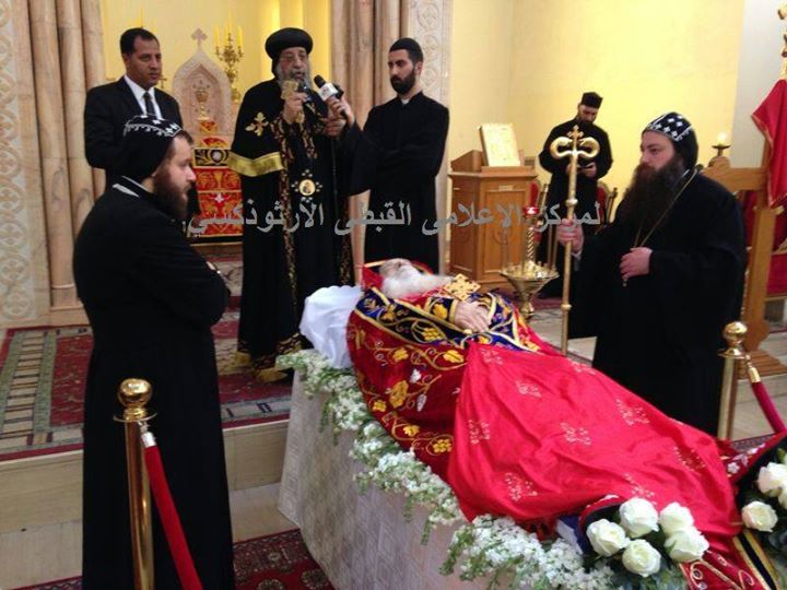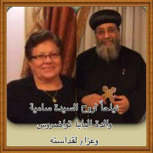 | فى 29/3/2014م تلقى البابا تواضروس الثاني اتصالا هاتفيا من المستشار عدلي منصور رئيس الجمهورية لتقديم العزاء في والدته. يذكر أن والدة البابا قد انتقلت أمس الجمعة، في مستشفى القديسين بالإسكندرية، وأقيمت طقوس الجنازة اليوم السبت في الكنيسة المرقسية هناك وعززت قوات الأمن من تواجدها في محيط كنيسة القديسين في الإسكندرية تزامنا مع وفاة والدة البابا تواضروس الثاني وتشييع الجنازة من الإسكندرية انتشرت سيارات الشرطة والمدرعات أمام بوابات الكنيسة وتم فرض إجراءات التفتيش الأمنية المحكمة لدخول المواطنين وتواجد سيارات المفرقعات انتظارا لتشييع الجثمان، بالكنيسة المرقسية كانت والده البابا انتقلت صباح أمس الجمعة بعد صراع مع المرض وكانت تتلقى العلاج في أحد المستشفيات القريبة من الكنيسة إثر إصابتها بوعكة صحية من عدة أيام. |