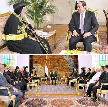 | فى 7/8/2014م وصف البابا تواضروس الثانى لقاء الرئيس برؤساء الطوائف المسيحية بأنه رسالة لاتجاه جديد يؤكد روح المواطنة الكاملة، مشيرًا إلى أن الرئيس التقى بالدكتور أحمد الطيب ووزير الأوقاف ومفتى الديار المصرية منذ فترة وقال البابا:" إن الرئيس يريد تحريك المجتمع في اتجاه واحد وتلك دلالة خير وخطوة إيجابية على الطريق الصحيح " وأضاف أن اللقاء معًا استمر أكثر من ساعة منفردين ومن ثم لقاء رؤساء الكنائس، وبعد السلام عدنا لنلتقط الصور الجماعية، وهي لافتة جميلة من الرئيس" وأكد أن الزيارة ستكون ضمن ذكريات التاريخ المصري وتضاف في الصفحة البيضاء للتاريخ وقال القس بولس حليم المتحدث باسم الكنيسة القبطية الأرثوذكسية ان ظاهرة اختطاف الفتيات كانت أهم القضايا التي ناقشها الرئيس عبد الفتاح السيسي مع رؤساء الكنائس المصرية وقال حليم إن اللقاء تطرق أيضا إلى بناء دار العبادة المسيحية نافياً أن اللقاء لم يتطرق لمناقشة الانتخابات البرلمانية أو التمثيل القبطي فيه. |