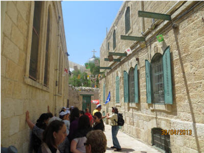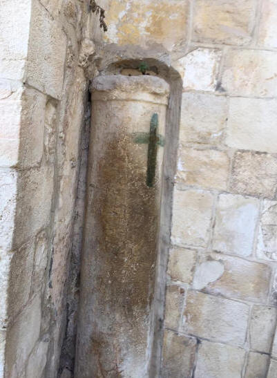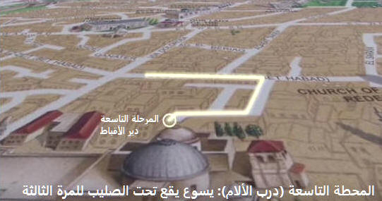 المرحلة التاسعة فى طريق الألام الذى مر فيه السيد المسيح بحراسة الجنود الرومان فى اورشليم القدس وفيه أحداث حدثت تركت ذكرى ليحتفل بها المسيحيين كل سنة : يسوع يقع تحت الصليب للمرة الثالثة |