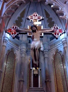 النوافذ الزجاجية للكنيسة ثلاثة احداث كما في الصورة: الى اليسار: بيلاطس يغسل يديه من الخطية بالوسط: يسوع يجلد ويُحكم عليه والجنود يضعون اكليل الشوك على رأسه الى اليمين: برباس يحصل على اطلاق صراحه بدل يسوع |