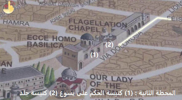 وتميز هذا الموقع علامة دائرية كبيرة عليها رقم المرحلة بالحروف اللاتينية [ II ] أى المرحلة رقم إثنين وهذه العلامة موجودة على حائط كنيسة الحكم من الخارج *** كنيسة الجلد الفرنسيسكانية : يقوم الدير بالقرب من موقع قلعة أنطونيا ويضم معهدا لدراسة الكتاب المقدس وهو مدرسة لإعداد معلّمي العلوم الكتابية. لدى دخولنا باحة الدير نجد إلى يميننا كنيسة الجلد. وكان في الموقع كنيسة من العصور الوسطى تحولت إلى اسطبل للحيوانات ومن ثمّ حانوتا للحياكة. عام ١٨٣٦ م. منحها إبراهيم باشا للفرنسيسكان الذين باشروا أعمال الترميم وافتتحوا الكنيسة للعبادة. وتحيي الكنيسة ذكرى جلد يسوع بالسياط قبل الحكم عليه بالموت. مقابل كنيسة الجلد، في الجهة الأخرى من الباحة، تقوم كنيسة الحكم التي بناها الفرنسيسكان في بداية هذا القرن والتي تحافظ على نمط الكنيسة البيزنطية القديمة. تمثل الرسوم ملائكة يحملون أدوات العذاب وصورة بيلاطس يغسل يديه وأخيرا يسوع وقد حمّلوه الصليب. |