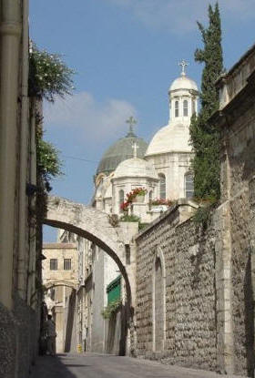 كنيسة الجلد الفرنسيسكانية : يقوم الدير بالقرب من موقع قلعة أنطونيا ويضم معهدا لدراسة الكتاب المقدس وهو مدرسة لإعداد معلّمي العلوم الكتابية. لدى دخولنا باحة الدير نجد إلى يميننا كنيسة الجلد. وكان في الموقع كنيسة من العصور الوسطى تحولت إلى اسطبل للحيوانات ومن ثمّ حانوتا للحياكة. عام 1836 م. منحها إبراهيم باشا للفرنسيسكان الذين باشروا أعمال الترميم وافتتحوا الكنيسة للعبادة. وتحيي الكنيسة ذكرى جلد يسوع بالسياط قبل الحكم عليه بالموت. مقابل كنيسة الجلد، في الجهة الأخرى من الباحة، تقوم كنيسة الحكم التي بناها الفرنسيسكان في بداية هذا القرن والتي تحافظ على نمط الكنيسة البيزنطية القديمة. |