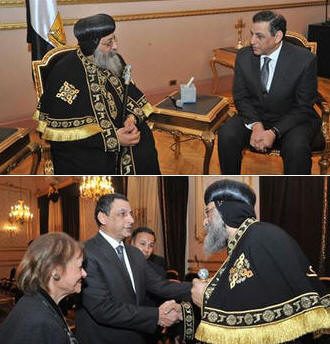 الإثنين 16 فبراير 2015 وزراء التضامن والصحة والشباب يعزون قداسة البابا .. استقبل قداسة البابا تواضروس الثاني بالمقر البابوي الدكتورة غادة والي وزير التضامن الاجتماعي والدكتور عادل عدوي وزير الصحة والمهندس خالد عبد العزيز وزير الشباب والرياضة ، قدم الوزراء الثلاثة تعازيهم لقداسة البابا في شهداء مصر الأبرار. |