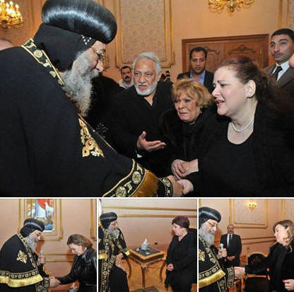 فى 21/2/2015م قداسة البابا تواضروس يستقبل نقيب الممثلين ووفد الفنانين استقبل قداسة البابا تواضروس الثاني بالمقر البابوي منذ قليل الفنان أشرف عبد الغفور نقيب الممثلين والفنانة رجاء الجداوي و الفنان يسرا والفنانة نيهال عنبر و الفنانه ناديه لطفي والفنانة دلال عبد العزيز والفنان سامح الصريطي للتعزية في الشهداء. |