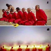 بالشهادتين إذا بحسب مفهوم شيخ الأزهر فكل مسلم ينطق بالشهادتين هو داعشى إرهابى مجرم !!!!!!!!!!!! الصورة الجانبية : هذا هو الله إله الإسلام أمر أتباعه الدواعشة المسلمين بقطع رؤوس المسيحيين بطريقة شيطانية جديدة فهم يربطون متفجرات بسلك بالقرب من الرأس بقنابل متفجرة عند عنق المسيحيين ثم يوصلون السلك السالب بالموجب فتنفجر القنابل وتطير رؤسهم لا ذنب لهم إلا أنهم مسيحيين خيروهم بين الإسلام (نطق الشهادتين) وتركهم أحياء ولكنهم رفضوا وفضلوا الموت مسيحيين عن أن يعيشوا مسلمين .. نحن لا نعرف أسمائهم ولكننا نقول لهم أيها الشهداء أذكرونا أمام عرش يسوع المسيح الديان العادل وفى المفهوم الإسلامى أيضا يسوع المسيح هو الديان الذى سيدين هؤلاء القتلة المسلمين ونسألهم بأى شريعة سيدينكم بشريعة القتل أم بشريعته هو شريعة الحب والسلام " (لا تقوم الساعة حتى ينزل فيكم ابن مريم حكما مقسطا) صحيح البخارى" ومن الواضح أن ألإسلام ما هو إلا خلافة خلفت الإمبراطورية رومانية وتسير على منهاجها وورثت نفس طرقها وأساليبها فى قتل المسيحيين فالمسلمين يقتلون أتباع الذى توفى أولا على الصليب ثم رفع ثانيا القرآن (إِذْ قَالَ اللَّهُ يَا عِيسَى إِنِّي مُتَوَفِّيكَ وَرَافِعُكَ إِلَيَّ وَمُطَهِّرُكَ مِنْ الَّذِينَ كَفَرُوا وَجَاعِلُ الَّذِينَ اتَّبَعُوكَ فَوْقَ الَّذِينَ كَفَرُوا إِلَى يَوْمِ الْقِيَامَةِ ثُمَّ إِلَيَّ مَرْجِعُكُمْ فَأَحْكُمُ بَيْنَكُمْ فِيمَا كُنْتُمْ فِيهِ تَخْتَلِفُونَ). [آل عمران: 55] ومن هم الذين كفروا بيسوع غير الذين لا يؤمنون به ولا بصلبه ولا بقيامته ويقتلون أتباعه أى المسيحيين ومن قول الله إله الإسلام سيظل المسيحيين فوق الذين كفروا إلى متى إلى يوم القيامة .. واليوم لقد مات ضمير العالم وهو يرى هذه المذابح مات وهو يرى الدولة الإسلامية تستولى على المدن والبيوت وتأخذها وكل ما فيها غنائم كأن البشرية رجعت إلى القبلية مات وهو يرى إغتصاب النساء وإستخدامهن لنكاح الجهاد وبيع الفتيات كعبيد مات وهو يرى الدولة الإسلامية تذبح مواطنى أمريكا وروسيا وفرنسا وإنجلترا مات وهو ويرى التهجير القسرى لليزيدين من مدنهم مات وهو يراهم يتساقطوا موتى فى الطريق مات وهو يرى المسيحيين يتحولون إلى لاجئين مات الضمير فماتت البشرية بموتهم راح العالم فى فوضى ولكن من الذى أمات ضمير العالم؟ .. إنه المال الأسود المستخرج من البترول الذى يحرك الغرب كله اليوم بطرق مشروعة وبطرق ملتوية .. كيف ؟ هذا هو السؤال الذى نريد الإجابة عليه من السياسيين فى العالم الغربى ولماذا أوصلوا الحروب فى ليبيا والعراق وسوريا واليمن والصومال وفى كينيا وطالتهم المجازر التى تحدث فى الغرب اليوم بين الحين والآخر؟ شهورا طويلة تخرج الطائرات الحلفاء محملة بالذخائر وترجع بحمولتها لأنهم لم يصادفوا هدفا متحركا وفى هذا الصدد وصف وزير الاعلام السوري عمران الزعبي الغارات الجوية البريطانية الأولى بانها صخب إعلامي وحربي لا أثر له على أرض الواقع .. سلحوا أالأكراد للهجوم على داعش ولكن حليفتهم تركيا نقضت عهود السلام مع الأكراد وضربتهم فى ظهورهم .. سلحوا الجيش الحر فى سوريا وبعض الفصائل بتكلفة 500 مليون دولار ولكنهم إنضموا إلي الدواعش وبعضهم تركوا السلاح لهم ما هذه المهازل التى نقرأ عنها .. إذا كان السياسيين من جميع الدول شرقا وغربا جاديين حقا فى القضاء على الإرهاب فليرونا كيف؟ ليجلسوا معا ويضعوا الخطط للقضاء علي الإرهاب الإسلامى .. ايها السياسيين .. إنه عندما يموت ضمير العالم فستقع حرب عالمية مفاجئة فى لحظات فالحرب القادمة حرب عالمية شاملة نتيجتها إما أن تتخلف البشرية مئات السنين أو ربما تعود لعصور ما قبل التاريخ أو يندثر الجنس البشرى كله وتدمر الأرض