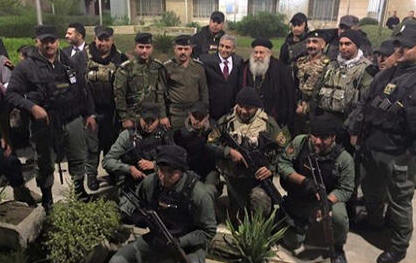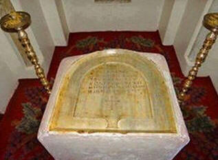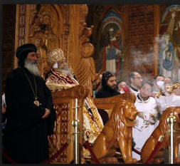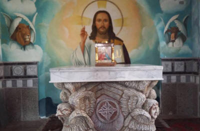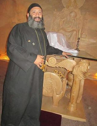 Abona Tomas Erian يقف أمام مذبح تحته تماثيل الحيوانات الأربعة الغير متجسدة