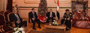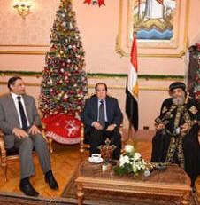 الأربعاء 6 يناير 2016 الرئيس عبد الفتاح السيسي يصل إلى الكاتدرائية للتهنئة وسط اجواء امتلأت بحفاوة الاستقبال لتكرار اللفتة الكريمة، وصل إلى الكاتدرائية المرقسية بالعباسية الآن رئيس الجمهورية عبد الفتاح السيسي لمشاركة الأقباط بعيد الميلاد المجيد، كان في إستقبال سيادته قداسة البابا تواضروس الثاني وأحبار الكنيسة المشاركين في الصلاة ، هذا وقد استقبل الشعب القبطي الحاضر الرئيس بعاصفة من التصفيق لدى دخوله الكنيسة الكبري بالكاتدرائية. وقد هنأ الرئيس عبد الفتاح السيسى الأقباط، خلال كلمته بالكاتدرائية المرقسية بالعباسية فى الاحتفال بأعياد الميلاد المجيد، قائلاً: "كل سنة وانتو طيبين، اسمحولى اقولكم كلمتين، فى البداية أوجهلكم التحية والتقدير والاحترام، وأهنيكم، كل عام وانتم بخير". وأضاف الرئيس السيسى :"السنة اللى فاتت قلنا عايزين نحب بعضنا بجد، ونحترم بعضنا بجد، يا رب نعرف نحب بعضنا بجد، وكل سنة وانتو طيبين"وعندما قاطعه الشعب القبطى عدة مرات بالتصفيق والهتافات قال السيسي ضاحكًا: «قداسة البابا هيزعل لاننا بنعطل الصلاة.. وخليني أقولكم إن السنة دي خير على كل المصريين والسنة الجاية هتبقى خير وسلام وأمن واستقرار لكل المصريين وتحيا مصر بينا كلنا». فى البداية أوجهلكم التحية والتقدير والاحترام، وأهنيكم، كل عام وانتم بخير. "من فضلكم توقفوا أمام كلامى جيدا.. ماحدش أبدا يقدر يفرق بينا.. لازم نرجع زى زمان أكتر ونبقى مع بعض ..ربنا يديم الحب". "أوصيكم وأوصى نفسى وكل الموجدين، مفيش حاجة تأذينا.. لا ظروف اقتصادية ولا سياسية ولا أى حاجة.. أى حاجة نقدر عليها إلا إننا نختلف" المصريون قادرون على التغلب على الصعاب - لن يستطيع أحد أن يفرق بين أبناء الشعب المصري - # تحيا_مصر بأهل مصر - # مصر ستعطى للعالم مثلاً حقيقياً للمحبة - # تحيا مصر بالمصريين جميعاً وعيد سعيد عليكم وعلينا احنا مش هنسى ابدا ليكم ولا قداسة البابا الموقف الوطنى العظيم عايز اوصيكم واوصي المصريين كلهم ...محدش ابدا هيفرق بينا...ده مهم جدا ..ومهم قوي ... كلنا لازم نبقي مع بعض ... ويديم الحب " ورداً على الهتافات المحبة له داخل الكاتدرائية، قال:"احنا بنحبكم جدا" وقد قدم الرئيس المصري اعتذاره للأقباط عن ما تم من إحراق وتدمير للكنائس خلال الفترة الماضية، مؤكداً العمل على ترميمها في أقرب وقت، وقال: "لن يوجد بيت واحد من بيوتكم، ولا كنيسة لم يتم إصلاحها" وشدد على أن "هذا ليس تفضلاً على الأقباط، ولكنه حق." . ومن جهة أخرى أصدرت المؤسسة الرآسية بيانا قالت فيه : لقد تشرفت أرض مصر الطاهرة باِستضافة العائلة المقدسة، مصر التي اختارها الله الحميد المجيد لتكون ملاذاً آمناً للسيد المسيح وأمه العذراء الطاهرة، فإن في ذلك دلالة بالغة على ما أراده الله سبحانه وتعالى لمصر، لتظل منبعاً للسلام والمحبة وموطناً للأمن والاستقرار، وهي قيم نبيلة يقتضي الحفاظ عليها أن نظل جميعاً مسلمين ومسيحيين يداً واحدة وصفاً واحداً، كما أعرب الرئيس عن ثقته الكاملة في أننا سنظل دوماً هكذا شعباً واحداً يبني ويعمر، وينشد الخير والسلام لأبنائه وللإنسانية بأسرها. ويجدد الرئيس تمنياته عشية عيد الميلاد المجيد لأبناء مصر جميعاً، مسلمين ومسيحيين، بكل الخير والتوفيق، ولمصرنا الحبيبة بكل التقدم والرفعة والازدهار، ويتوجه إلى الله الحميد المجيد ليجمعنا دوماً معاً، وليوحد صفوفنا ويحمي وطننا من كل مكروه وسوء، ويتلطف علينا بنِعم الأمن والسلام والمحبة. أبرزت وكالة "أسوشيتدبرس" الأمريكية احتفال أقباط مصر بعيد الميلاد، وسط إجراءات أمنية مشددة، وزيارة الرئيس عبد الفتاح السيسى للكاتدرائية المرقسية بالعباسية لتهنئة الأقباط في عيدهم، موضحة أن الزيارة التي تتكرر للعام الثاني تحظى بـ"تقدير مضاعف"، مضيفةً أنه "قدَّم اعتذارا علنيا ونادرا للأقباط". وقالت الوكالة، إن "المسيحيين الأرثوذوكس في مصر توافدوا إلى الكنائس ليل الأربعاء لحضور قداس عيد الميلاد، في الوقت الذي تواصل فيه الدولة محاربة ا