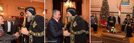 اﻷربعاء 6 يناير 2016 وزراء الري والتعليم العالي والتجارة يهنئون قداسة البابا. هنأ الدكتور حسام المغازي وزير الموارد المائية والري والمهندس طارق قابيل وزير التجارة والصناعة والدكتور أشرف شيحة وزير التعليم العالي قداسة البابا بعيد الميلاد المجيد. جاء ذلك خلال استقبال قداسته لهم اليوم بالمقر البابوي بالكاتدرائية المرقسية - اﻷنبا رويس وأشار قداسة البابا خلال لقائه بالوزراء إلى أن الكنيسة القبطية أرثوذكسية (أي مستقيمة) ﻷنها حافظت على اﻹيمان الذي تسلمته دون أن تغير فيه مما جعلها بمثابة متحف للتاريخ المسيحي. فيما أعلن وزير الري عن أن اﻷحد المقبل سيشهد افتتاح متحف النيل الذي يعرض وثائق تتعلق بالحضارة الفرعونية وحضارات دول حوض النيل. هذا وقد اقترح قداسة البابا أن تقام مسابقة لكل المصريين لتشجيعهم على تسمية أطفالهم بأسماء نهر النيل. |