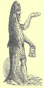 الإله داجون صنم الفلسطينيين “داجون”، أو “دجن” اسم كنعاني من "داجان" ومعنا الكنعانى"حنطة". ولكن جزء من أسمه "داج" ومعناه "سمكة" وهو إله عبده الكنعانيون وكان إله الخصوبة وعبده الفلسطينيين لاحقا وهو اسم صنم عند الفلسطينيين (1 صم 5: 1-3) وهو من الآلهة الضاربة فى القدم كما انه شقيق الإله إيل وأقدم من الإله بعل ويرد ذكره أحيانا في بعض النصوص السورية في أوغاريت كأب « لبعل ». وقد تكرر إسم "داجون" الإله الذى كان يعبده الفلسطينييين فى أسفار عديدة فى يشوع (يش 15: 41) وقضاة (قض 16: 23) وصموئيل الأول (1 صم 5: 2) وأخبار الأيام الأول (1اخ 10: 10) والفلسطينيون فى ألأصل شعب من اليونانيين الذين أسسوا مستعمرات كثيرة على شاطئ البحر المتوسط فى بلاد كثيرة ومنها فى غزة وعسقلان بإسرائيل ومستعمراتهم إمتدت فى جميع بلدان حوض البحر المتوسط وعند وصولهم إلى الأرض تم عبادة داجون الذى يشبه بوسيدون. كان بوسيدون في الأصل إله أرض (خثوني) مرتبطًا بالخصوبة ، وفي وقت لاحق إرتبط بالبحر فقط لهذا يظهر الجزء الخلفى منه كسمكة والأمامى كإنسان وأحيانا نصفه الأعلى إنسانا (أنثى) ونصفى السفلى سمكة وهو يشبه كثيرا الآلهة الوثنية التى دائما تماثيلها جزء منها إنسانا وجزء حيوان او طيور وكان لليونانيين دين منفتح جدًا أخذوا خليطا من آلهتهم والآلهة الوثنية الأخرى وعبدوها ولم يكن إدخال الإله "الجديد" مشكلة. في الواقع ، لم ير الإغريق أبداً آلهتهم أبعادًا واحدة ، وكان للعديد منهم أكثر من مظهر واحد. . ويذكر الكتاب المقدس ثلاث حوادث حدثت في هيكل للإله داجون: (1) ففي هيكل الفلسطينيين لداجون مات شمشون (قض 16: 23-30). واما اقطاب الفلسطينيين فاجتمعوا ليذبحوا ذبيحة عظيمة لداجون الههم ويفرحوا وقالوا قد دفع الهنا ليدنا شمشون عدونا. (2) وقد قتل الفلسطينيون في أشدود عندما أخذ تابوت العهد إلى هيكل داجون إلههم (1 صم 5: 1-7) وسقط تمثال إلههم إلى الأرض.(1 صم 5: 2) واخذ الفلسطينيون تابوت الله وادخلوه الى بيت داجون واقاموه بقرب داجون.(1 صم 5: 3) وبكر الاشدوديون في الغد واذا بداجون ساقط على وجهه الى الارض امام تابوت الرب.فاخذوا داجون واقاموه في مكانه1 صم 5: 7) ولما راى اهل اشدود الامر كذلك قالوا لا يمكث تابوت اله اسرائيل عندنا لان يده قد قست علينا وعلى داجون الهنا.(1اخ 10: 10) ووضعوا سلاحه في بيت الهتهم وسمروا راسه في بيت داجون (3) بعد معركة جلبوع التي انتصر فيها الفلسطينيون على العبرانيين أخذ رأس شاول وعلق في هيكل داجون (1 أخبار 10: 10) في بيت شان. وقد كشف التنقيب الأثرى عن هذا الهيكل. وقد كان هذا الإله يعبد في فينيقية. وتقول نصوص اكتشفت في رأس شمرا "داجان" أو "داجون" أب اليان وهو بعل كان يعبد كإله الحنطة. وله هيكل في أوجريت أو رأس شمرا. وقد ظن بعضهم أن التمثال الذي نصفه الأعلى إنسان ونصفه الآخر سمكة هو تمثال داجون. ويذكر ديدوروس الصقلي آلهس الصقلي آلهة في اشقلون إحدى مدن فلسطين اسمها "دركيتو" نصفها السفلي على هيئة سمكة ونصفها العلوي على شكل امرأة. 4) ويبدو أن عدم السير على عتبة هيكل داجون، من طقوس الفلسطينيين (1صم 5: 4) وبكروا صباحا في الغد واذا بداجون ساقط على وجهه على الارض امام تابوت الرب وراس داجون ويداه مقطوعة على العتبة.بقي بدن السمكة فقط.(1 صم 5: 5) لذلك لا يدوس كهنة داجون وجميع الداخلين الى بيت داجون على عتبة داجون في اشدود الى هذا اليوم( ويظن بعض العلماء أن داجون كان يعبد في أكاد في القرن الخامس والعشرين قبل الميلاد. يظهر الإله داجون على مسكوكات جزيرة أرواد ومدينة صور حيث كان يعرف “بملقارت” أو “ملك قرت” أي إله المدينة. وعرف في بيروت “ببعل بريت” أي سيد بيروت. وكان يمثل على مسكوكات جزيرة أرواد بشكل شخص له رأس بشري وذنب سمكة كبيرة وزعانفها، كما كان رأسه يظهر على بعض المسكوكات مزداناً بإكليل من ورق الغار. ويظهر رأسه على مسكوكات صور بعذار، ويلبس فوق كتفيه جلداً مرموقاً حول عنقه بالمخالب. وأما على مسكوكات بيروت فكان يظهر بشكل شخص يسوق مركبة بحرية تجرها أربعة خيول من خيول البحر المجنحة. كان داج