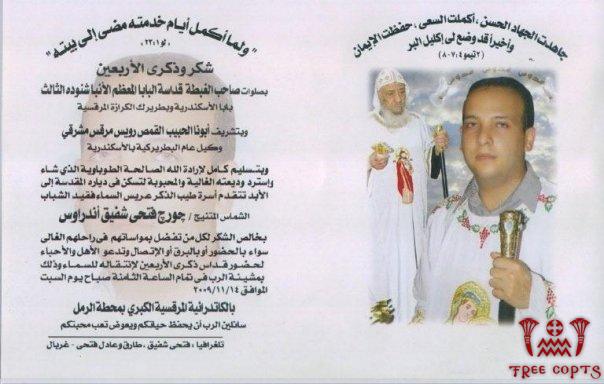موسوعة تاريخ أقباط مصر - coptic history بقلم عزت اندراوس   تذكار الأربعين للشهيد جورج فتحى بالكاتدرائية  |