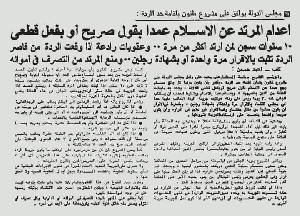 في عصر السادات سنة ١٩٧٨8 قدم الأزهر مشروع تطبيق الشريعة في البرلمان، ووافق عليه السادات والقضاء المصري ممثلا في مجلس الدولة.. الصورة من قانون قتل المرتد وقتها ضمن صنوف المشروع الإسلامي، علما بأن الجهاديين ليسوا من طالب به..بل الأزهر والرئيس.. خطورة المشروع ليس فقط في إكراه الناس على الإسلام وقتل مخالفيه، ولكن في فتنة اجتماعية كبرى تجعل من قتل المختلف في الرأي أسهل من شرب الماء.. رسالة لجميع المسئولين التنوير مشروع دولة وقضاء ودستور...لا أزهر وجماعات، وآديكم شايفين مجرد ما السادات رفع شعار الإسلام والخلافة والإيمان شجع الشيوخ على تطبيق ما يؤمنون به من أفكار رجعية وكارثية شربنا منها الدم والكراهية لعشرات السنين.. ما بالكم لو تبنى الرئيس التنوير بشكل حقيقي وفرضه فرضا، هل وقتها سنجد الفقهاء والقضاء في صف خصومه أم في صفه؟ على الدولة والأزهر أن يكفروا عن غلطتهم..والأجواء حاليا تسمح بهذا الاعتذار بفرصة لن تتكرر.. ستحفظ الناس والمجتمع والدولة من شرور الإرهاب الديني ربما للأبد..