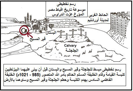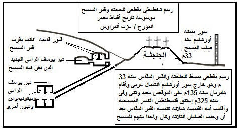 (1) ــ اما السبب الثالث فيرجع إلي تقليد قديم يعود إلي ما قبل المسيحية، بان جمجمة ادم وجدت هناك. واول من ذكر هذا التقليد هو اوريجانوس ( 185 ــ 253 م ) الذي عاش في اورشليم عشرين عاما، حيث كتب يقول : " لقد سمعت تقليدا يقول بان جسد ادم الانسان الاول قد دفن في نفس الموضع الذي صلب فيه المسيح ". وقد إشار إلي نفس هذا التقليد اثناسيوس وابيفانيوس وباسيليوس القيصري وفم الذهب وغيرهم من الكتاب، وما زال هذا التقليد يتردد إلي يومنا هذا، حيث يشار إلي وجود قبر ادم وجمجمته في كهف محفور اسفل الجلجثة. ويعد هذا اقدم تفسير لاسم " الجلجثة " وبالرغم مما يبدو من غرابته لارتباطه بادم، الا انه قد يكون اكثرها قربا من الحقيقة.