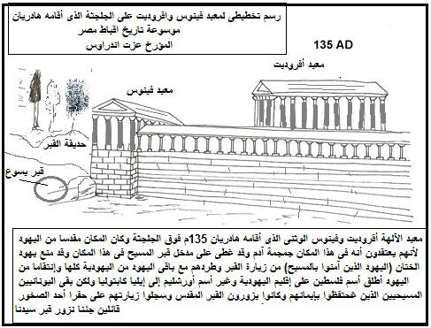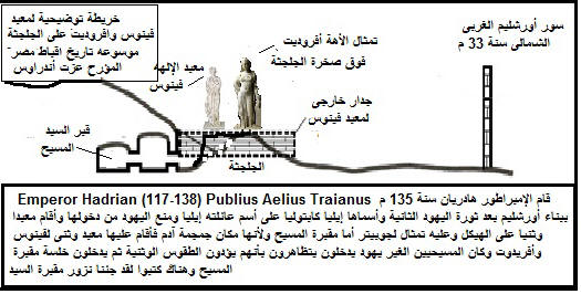 قام الإمبراطور الرومانى بإعمار مدينة أورشليم بعد ثورة اليهود الثانية (132 - 135م) بإعتبارها مدينة رومانية وأسماها إيليا كابتولينا كما أطلق أسم فلسطين أعداء اليهود التقليديين على إقليم اليهودية إنتقاما وعندا فى اليهود الذى أنتهى من الوجود كشعب بعد الغزو البابلى سنة 586 ق. م وقد أقام هادريان معبدا وثنيا على أسم أفروديت وفينوس وأقام سورا مصمتا حول الجلجثة وملئه بالتراب وأقام عليه معبده ونصب تماثيل هذه الآلهة وتمثالا له فى داخل المعبد فى محاولة منه إغاظة اليهود والمسيحيين اليهود الذين يعتقدون أنه فى هذا المكان مقبرة آدم وكذلك اليهود المسيحيين الذى صلب سسيدهم فى هذا المكان