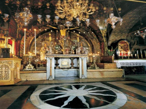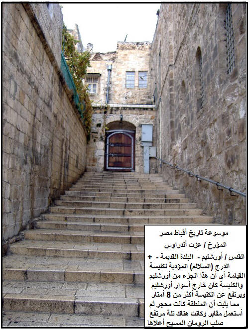 وكانت الجلجثة وقبر المسيح اصلا محجرا يقطع منه الأحجار لقربه من المدينة لإستعمالها فى البناء وقد توقف إستعماله قبل إستعمال الرومان له فى صلب المجرمين وقد أستعمل كمقابر وما زالت توجد هذه المقابر أسفل كنيسة القيامة وكان هذا المحجر خارج أسوار أورشليم / القدس أثناء حكم هيرودس الكبير الصورة المقابلة : الدرج (السلالم ) التى تؤدى إلى كنيسة القيامة وهو أحد مدخلين فالخارج من كنيسة القيامة يجب أن يصعد هذه السلالم ليسير فى طرقات القدس وهذا دليل أن مستوى كنيسة القيامة أسفل هذا الجزء من بلدة القدس بحوالى 8 أمتار وكانت كنيسة القيامة وهذا الجزء من البلدة خارج أسوار اورشليم حتى أدخله الرومان سنة 135م فى البلدة وبنوا حولها سورا لحمايتها وجاء من بعدهم البيزنطيين وبنوا سورهم على أساس الرومان حتى يحموا كنيسة القيامة وفى النهاية أقاموا العثمانيين سورا وظلت كنيسة القيامة داخل أسوار القدس والمدخل الآخر لكنيسة القيامة فى مستوى بلدة القدس |