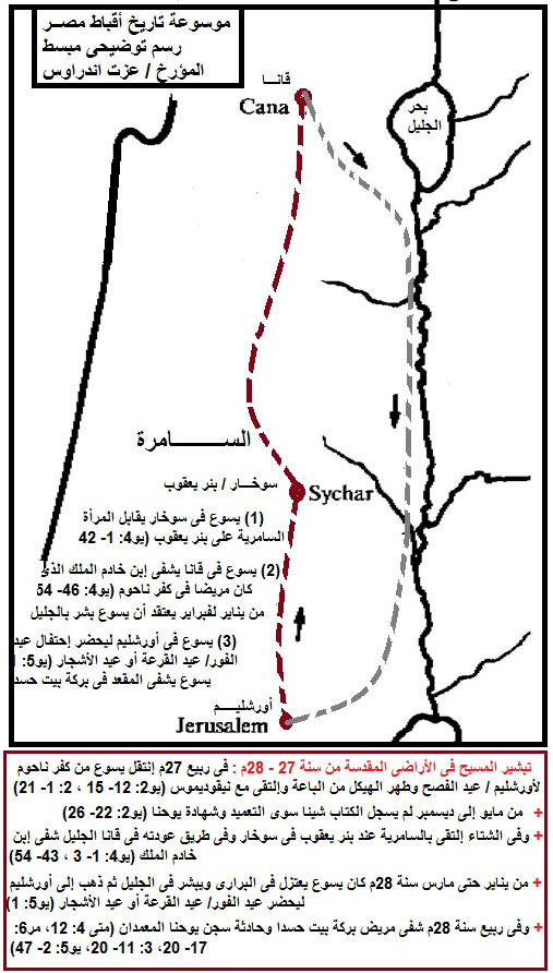 الفصل السادس: قمنا فى هذا الفصل من مجمل الأناجيل الأربعة وتاريخها وجغرافيتها بجمع كل آيات الأناجيل الأربعة ورتبنا هذه ألايات وصنفناها طبقا للتسلسل الزمنى ورحلات السيد المسيح التبشيرية وجارى العمل بوضع أجزاء تاريخية وجغرافيا للدارس والباحث الإنجيلى ويحتوى الفصل السادس على : - ***************************************************** حرف(ت) تعنى التفسير - حرف(ش) تعنى شبهات الشبهات الوهمية على آيات صفحة الفصل السادس : تفسير إنجيل متى على الفصل السادس & تفسير إنجيل مرقس على الفصل6 & تفسير إنجيل لوقا على الفصل6 - تفسير إنجيل يوحنا - مجمل الأناجيل الأربعة : الفصل 6 مجمل الأناجيل الأربعة: الفصل السادس (يو4: 4- 42) 4 وكان لا بد له ان يجتاز السامرة. 5 فاتى الى مدينة من (يو4: 43- 54) 43 وبعد اليومين خرج من هناك ومضى الى الجليل. 44 لان يسوع نفسه شهد ان ليس لنبي كرامة في وطنه. 45 فلما جاء الى الجليل قبله الجليليون اذ كانوا قد عاينوا كل ما فعل في اورشليم في العيد.لانهم هم ايضا جاءوا الى العيد. 46 فجاء يسوع ايضا الى قانا الجليل حيث صنع الماء خمرا. وكان خادم للملك ابنه مريض في كفر ناحوم. 47 هذا اذ سمع ان يسوع قد جاء من اليهودية الى الجليل انطلق اليه وساله ان ينزل ويشفي ابنه لانه كان مشرفا على الموت. 48 فقال له يسوع لا تؤمنون ان لم تروا ايات وعجائب. 49 قال له خادم الملك يا سيد انزل قبل ان يموت ابني. 50 قال له يسوع اذهب.ابنك حي.فامن الرجل بالكلمة التي قالها له يسوع وذهب. 51 وفيما هو نازل استقبله عبيده واخبروه قائلين ان ابنك حي. 52 فاستخبرهم عن الساعة التي فيها اخذ يتعافى فقالوا له امس في الساعة السابعة تركته الحمى. 53 ففهم الاب انه في تلك الساعة التي قال له فيها يسوع ان ابنك حي.فامن هو وبيته كله. 54 هذه ايضا اية ثانية صنعها يسوع لما جاء من اليهودية الى الجليل (لو4: 16- 30) 16 وجاء الى الناصرة حيث كان قد تربى . ودخل المجمع حسب عادته يوم السبت وقام ليقرا. 17 فدفع اليه سفر اشعياء النبي.ولما فتح السفر وجد الموضع الذي كان مكتوبا فيه 18 روح الرب علي لانه مسحني لابشر المساكين ارسلني لاشفي المنكسري القلوب لانادي للماسورين بالاطلاق وللعمي بالبصر وارسل المنسحقين في الحرية 19 واكرز بسنة الرب المقبولة. 20 ثم طوى السفر وسلمه الى الخادم وجلس.وجميع الذين في المجمع كانت عيونهم شاخصة اليه. 21 فابتدا يقول لهم انه اليوم قد تم هذا المكتوب في مسامعكم. 22 وكان الجميع يشهدون له ويتعجبون من كلمات النعمة الخارجة من فمه ويقولون اليس هذا ابن يوسف. 23 فقال لهم.على كل حال تقولون لي هذا المثل ايها الطبيب اشفي نفسك.كم سمعنا انه جرى في كفر ناحوم فافعل ذلك هنا ايضا في وطنك. 24 وقال الحق اقول لكم انه ليس نبي مقبولا في وطنه. 25 وبالحق اقول لكم ان ارامل كثيرة كن في اسرائيل في ايام ايليا حين اغلقت السماء مدة ثلاث سنين وستة اشهر لما كان جوع عظيم في الارض كلها. 26 ولم يرسل ايليا الى واحدة منها الا الى امراة ارملة الى صرفة صيدا. 27 وبرص كثيرون كانوا في اسرائيل في زمان اليشع النبي ولم يطهر واحد منهم الا نعمان السرياني. 28 فامتلا غضبا جميع الذين في المجمع حين سمعوا هذا. 29 فقاموا واخرجوه خارج المدينة وجاءوا به الى حافة الجبل الذي كانت مدينتهم مبنية عليه حتى يطرحوه الى اسفل. 30 اما هو فجاز في وسطهم ومضى (متى4: 18- 22) (2) 18 واذ كان يسوع ماشيا عند بحر الجليل ابصر اخوين سمعان الذي يقال له بطرس واندراوس اخاه يلقيان شبكة في البحر فانهما كانا صيادين. 19 فقال لهما هلم ورائي فاجعلكما صيادي الناس. 20 فللوقت تركا الشباك وتبعاه. 21 ثم اجتاز من هناك فراى اخوين اخرين يعقوب بن زبدي ويوحنا اخاه في السفينة مع زبدي ابيهما يصلحان شباكهما فدعاهما. 22 فللوقت تركا السفينة واباهما وتبعاه (مر1: 21- 28) (3) (ش2) 21 ثم دخلوا كفرناحوم وللوقت دخل المجمع في السبت وصار يعلم. 22 فبهتوا من تعليمه لانه كان يعلمهم كمن له سلطان وليس كالكتبة.(4) 23 وكان في مجمعهم رجل به روح نجس.فصرخ 24 قائلا اه ما لنا ولك يا يسوع الناصري.اتيت لتهلكنا.انا اعرفك من انت قدوس الله. 25 فانتهره يسوع قائ