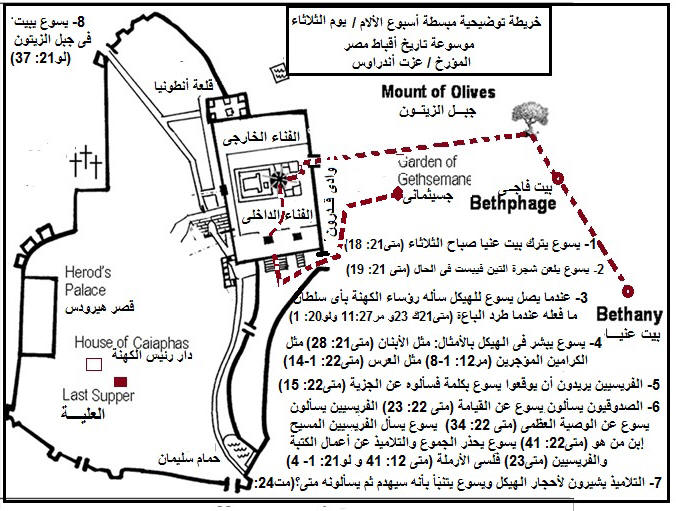 الفصل الثالث والعشرين: قمنا فى هذا الفصل من مجمل الأناجيل الأربعة وتاريخها وجغرافيتها بجمع كل آيات الأناجيل الأربعة ورتبناها وصنفناها طبقا للتسلسل الزمنى ورحلات السيد المسيح التبشيرية وجارى العمل بوضع أجزاء تاريخية وجغرافيا للدارس والباحث الإنجيلى ******************************************************** - حرف(ش) تعنى شبهات : الشبهات الوهمية على آيات صفحة الفصل الثانى والعشرون وبها الشبهات والردود عليها : تفسير متى على الفصل الثالث والعشرين - تفسير مرقس على الفصل23 - تفسير لوقا 20: 1- 47 & مجمل الأناجيل الأربعة: الفصل الثالث والعشرين (متى21: 18- 22) 18 وفي الصبح اذ كان راجعا الى المدينة جاع. 19 فنظر شجرة تين على الطريق وجاء اليها فلم يجد فيها شيئا الا ورقا فقط.فقال (مر 11: 22- 26) 22 فاجاب يسوع وقال لهم :«ليكن لكم ايمان بالله. 23 لاني الحق اقول لكم: ان من قال لهذا الجبل: انتقل وانطرح في البحر! ولا يشك في قلبه، بل يؤمن ان ما يقوله يكون، فمهما قال يكون له. 24 لذلك اقول لكم: كل ما تطلبونه حينما تصلون، فامنوا ان تنالوه، فيكون لكم. 25 ومتى وقفتم تصلون، فاغفروا ان كان لكم على احد شيء، لكي يغفر لكم ايضا ابوكم الذي في السماوات زلاتكم. 26 وان لم تغفروا انتم لا يغفر ابوكم الذي في السماوات ايضا زلاتكم. (متى21: 23- 27) (1) 23 ولما جاء الى الهيكل تقدم اليه رؤساء الكهنة وشيوخ الشعب وهو يعلم قائلين باي سلطان تفعل هذا ومن اعطاك هذا السلطان. 24 فاجاب يسوع وقال لهم وانا ايضا اسالكم كلمة واحدة فان قلتم لي عنها اقول لكم انا ايضا باي سلطان افعل هذا. 25 معمودية يوحنا من اين كانت.من السماء ام من الناس.ففكروا في انفسهم قائلين ان قلنا من السماء يقول لنا فلماذا لم تؤمنوا به. 26 وان قلنا من الناس نخاف من الشعب.لان يوحنا عند الجميع مثل نبي. 27 فاجابوا يسوع وقالوا لا نعلم.فقال لهم هو ايضا ولا انا اقول لكم باي سلطان افعل هذا (متى21: 28- 32) 28 ماذا تظنون.كان لانسان ابنان فجاء الى الاول وقال يا ابني اذهب اليوم اعمل في كرمي. 29 فاجاب وقال ما اريد.ولكنه ندم اخيرا ومضى. 30 وجاء الى الثاني وقال كذلك.فاجاب وقال ها انا يا سيد.ولم يمض. 31 فاي الاثنين عمل ارادة الاب.قالوا له الاول.قال لهم يسوع الحق اقول لكم ان العشارين والزواني يسبقونكم الى ملكوت الله. 32 لان يوحنا جاءكم في طريق الحق فلم تؤمنوا به.واما العشارون والزواني فامنوا به.وانتم اذ رايتم لم تندموا اخيرا لتؤمنوا به (مر12: 1- 8) (2) 1 وابتدا يقول لهم بامثال انسان غرس كرما واحاطه بسياج وحفر حوض معصرة وبنى برجا وسلمه الى كرامين وسافر. 2 ثم ارسل الى الكرامين في الوقت عبدا لياخذ من الكرامين من ثمر الكرم. 3 فاخذوه وجلدوه وارسلوه فارغا. 4 ثم ارسل اليهم ايضا عبدا اخر.فرجموه وشجوه وارسلوه مهانا. 5 ثم ارسل ايضا اخر.فقتلوه.ثم اخرين كثيرين فجلدوا منهم بعضا وقتلوا بعضا. 6 فاذ كان له ايضا ابن واحد حبيب اليه ارسله ايضا اليهم اخيرا قائلا انهم يهابون ابني. 7 ولكن اولئك الكرامين قالوا فيما بينهم هذا هو الوارث.هلموا نقتله فيكون لنا الميراث. 8 فاخذوه وقتلوه واخرجوه خارج الكرم. (مر12: 9) (3) 9 فماذا يفعل صاحب الكرم.ياتي ويهلك الكرامين ويعطي الكرم الى اخرين. (متى 21: 41) 41 قالوا له.اولئك الاردياء يهلكهم هلاكا رديا ويسلم الكرم الى كرامين اخرين يعطونه الاثمار في اوقاتها.(ش3) (متى 21: 43) 43 لذلك اقول لكم ان ملكوت الله ينزع منكم ويعطى لامة تعمل اثماره.(ش4) (متى 21: 42) (4) 42 قال لهم يسوع اما قراتم قط في الكتب.الحجر الذي رفضه البناؤون هو قد صار راس الزاوية.من قبل الرب كان هذا وهو عجيب في اعيننا. (لو20: 18) (5) 18 كل من يسقط على ذلك الحجر يترضض.ومن سقط هو عليه يسحقه. (لو20: 19) (6) 19 فطلب رؤساء الكهنة والكتبة ان يلقوا الايادي عليه في تلك الساعة ولكنهم خافوا الشعب.لانهم عرفوا انه قال هذا المثل عليهم (متى 21: 46) 46 واذ كانوا يطلبون ان يمسكوه خافوا من الجموع لانه كان عندهم مثل نبي (متى22: 1- 14) 1 وجعل يسوع يكلمهم ايضا بامثال قائلا. 2 يشبه ملكوت السموات انسانا ملكا صنع عرسا لابنه. 3 وارسل عبيده ليدعوا المدعوين الى العرس فل