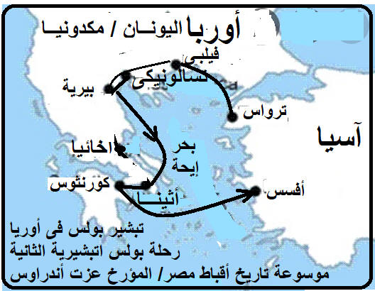1) " «فَٱجْتَازَا فِي أَمْفِيبُولِيسَ وَأَبُولُونِيَّةَ، وَأَتَيَا إِلَى تَسَالُونِيكِي، حَيْثُ كَانَ مَجْمَعُ ٱلْيَهُودِ»." التبشير فى أوربا (اليونان) أثناء رحلة بولس التبشيرية الثانية