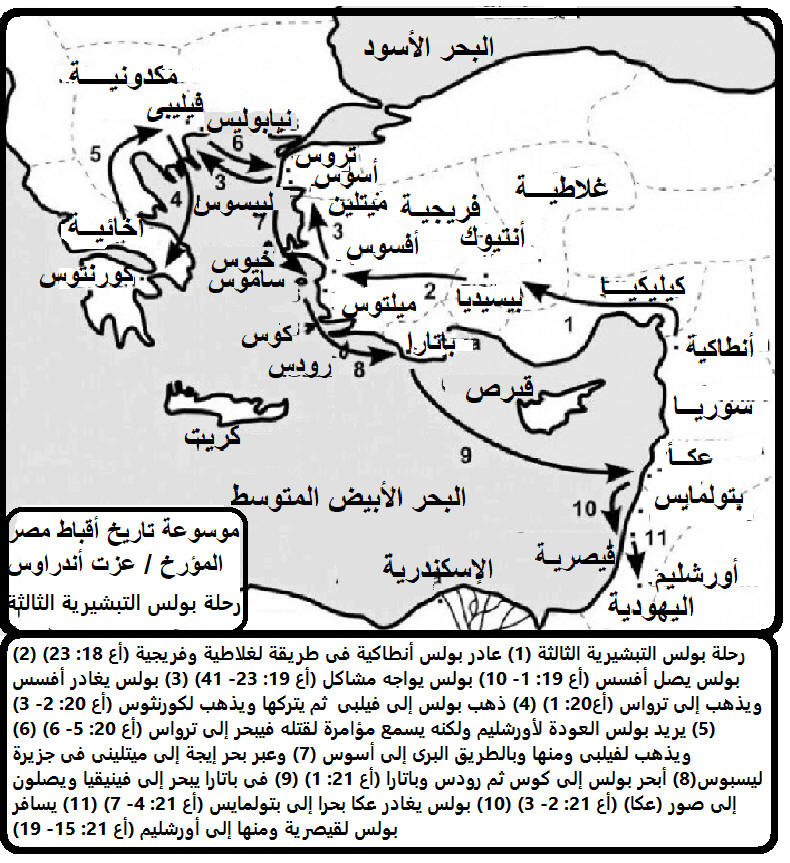 رحلة بولس التبشيرية الثالثة: آسيا الصغرى واليونان عندما كان بولس ييبشرأفسس في البداية وعد اليهود في المجمع أنه سيعود إليهم إذا شاء الرب. ولتنفيذ هذا الوعد، رحل من مناطق غلاطية وفريجية على طول الطريق البرِّيّ، مخترقًا مناطق جبلية وعرة إلى أفسس، على الشاطئ الغربي من آسيا الصغرى. وعندما وصل إلى هناك تقابل مع أثني عشر رجلاً معترفين بأنَّهم تلاميذ. وبينما كان يتكلَّم معهم، أدرك أنتعمدوا بمعمدية يوحنا وآمنوا بالمسيح وتساءل هل قبلوا الروح القدس فعلاً. وعظ بولس الرسول في مجمع اليهود 3 أشهر ولما قاومه اليهود اعتزلهم (أع19: 8-12). وظل يعلِّم في مدرسة تيرانس سنتين لليهود ولليونانيين. فقبل كثير من اليهود والأمم الإيمان. ونتيجة الإيمان أحرق كثيرون من السحرة كتب السحر (أع19:19). ولما انهارت عبادة أرطاميس قام صنَّاع الفضة بثورة (أع19: 24-29). وتأسست في أفسس كنيسة عظيمة لها قسوسها (أع20) (تقع ميليتس جنوب أفسس). وبعد أن ترك بولس أفسس خدم فيها تلميذه تيموثاوس (اتى1: 3). وأرسل بولس هذه الرسالة إلى أفسس بيد تلميذه تيخيكس (أف 6: 21+ 2تى 12:4). وأفسس هي إحدى الكنائس السبع التي أرسل لها السيد المسيح رسائل في سفر الرؤيا. وفي أفسس قضى القديس يوحنا اللاهوتي أواخر أيامه، وتنيح في جزيرة بطمس وهي في مقابل أفسس. وفي سنة 431 م. انعقد فيها مجمع مسكوني. وصارت أفسس الآن قرية أفيس ولا يوجد بها مسيحيون تنفيذًا لنبوة السيد المسيح أنه سيزحزح منارتها لأنها تركت محبتها الأولى (رؤ 2: 5). +++ فِيمَا كَانَ أَبُلُّوسُ فِي كُورِنْثُوسَ ... أي قبل وصول بولس إلى أفسس. +++ ٱجْتَازَ فِي ٱلنَّوَاحِي ٱلْعَالِيَةِ ... أي إقليم غلاطية وإقليم فريجية (أع ١٨: ٢٣).23 وبعدما صرف زمانا خرج واجتاز بالتتابع في كورة غلاطية وفريجية يشدد جميع التلاميذ. " وهما مرتفعتان عن أفسس لأنها في الساحل وسكت لوقا عن حوادث هذا السفر الطويل جرياً على عادته أن لا يفصل غير أمور الأماكن التي دخلها بولس حديثاً. تشير ھذه إلى الطريق الرومانى الفرعى البديل عبر الريف الأعلى والمؤدي إلى الكنائس التي بدأھا بولس في نشاطه التبشيرى السابق في جنوب غالطية +++ جَاءَ إِلَى أَفَسُسَ .... إنجازاً لوعده في (أع 18: 21).23 وبعدما صرف زمانا خرج واجتاز بالتتابع في أقليمى غلاطية وفريجية يشدد جميع التلاميذ. " وتلك المدينة مركز خدمته في ذلك السفر وهو سفره الثالث كما كانت كورنثوس مركز الجزء الآخر من خدمته في السفر الثاني. وجاء بولس بعد ذلك الى افسس حيث استغرقت خدمته فى المدينة نحو ثلاث سنوات , وكانت مدينة افسس تتميز بمصدرين للقوة التى تعتمد عليها فى ازدهارها .. الاول : موقعها التجارى .. أنها ميناء هام على بحر ايجة تربط البلاد الخارجية بالمدن الداخلية فى ولاية اسيا الرومانية وان كانت الرواسب الطينية التى يجلبها اليها نهر " مياندر " قد اثرت فى هذه الآهمية فى ايام بولس الرسول رغم الجهود التى بذلت لتحسين حالة الميناء ... الثانى : مركزها الدينى ... كمقر عبادة ارطاميس الهة الخصب , وكان هيكلها مورد رزق لسكان المدينة من كثرة تدفق افواج السياح المقتدرين لزيارة هيكل ارطاميس ... وأفسس مدينة كبيرة قديمة جعلها الرومانيون عاصمة إقليم / كورة آسيا. موقعها على مصب نهر كيستر على التخم الغربي من آسيا الصغرى. اشتهرت يومئذ بسعة متجرها وثروتها وعبادتها للأوثان وممارسة أهلها السحر وكان فيها ملعب يسع ثلاثين ألف مشاهد. قصد بولس أن يجعلها حصن المسيحية وعقد فيها مجمع أفسس المسكونى فى 431م لمحاكمة نسطور بطريرك القسطنطينية في آسيا كما جعل كورنثوس حصن المسيحية في بلاد اليونان. كان فيها هيكل أرطاميس وهذا الهيكل بُني سنة ٦٠٠ ق. م واحترق ليلة ولادة اسكندر الكبير سنة ٣٥٦ ق. م ثم جُدد فصار إلى بهاء أعظم من بهائه الأول حتى حُسب يومئذ من عجائب الدنيا السبع. وهُدمت أفسس سنة ٢٦٢ ب. م ولم تزل في موقعها أطلال كثيرة واسعة وقرية صغيرة اسمها اليوم أيّاسالوك. "كان ھذا أھم مدينة في آسيا، حيث كان بولس قد ُمنع من الذھاب فى (أع 6: 16) .لقد توقف ھناك . ً لفترة موجزة في (أع 