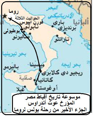 رحلة بولس إلى روما وتحطُّم السفينة سفر بولس من مليطة إلى رومية وأسره فيها (أع 28: 11- 31) وصل بولس إلى روما عن طريق برى من ميناء بوطيولي. ٍ، فإن مجموعتين من الإخوة ذهبتا لإستقباله: واحدة منهما جاءت إلى فورن أبيوس على بعد 70 كلم من روما. أمّا الثانية فجاءت إلى الحوانيت الثلاثة التي تبعد عن روما نحو 50كم. لقد سُرَّ بولس وتشجَّع كثيرًا بإظهار المحبّة هذه من قبل القديِّسين في روما.