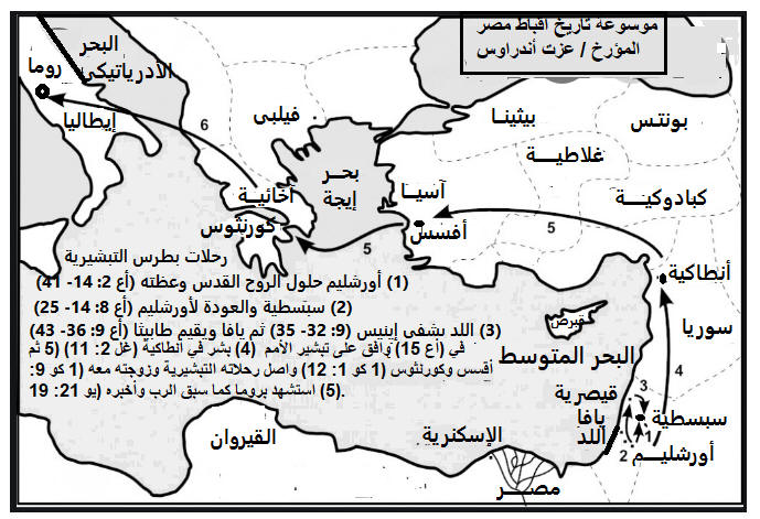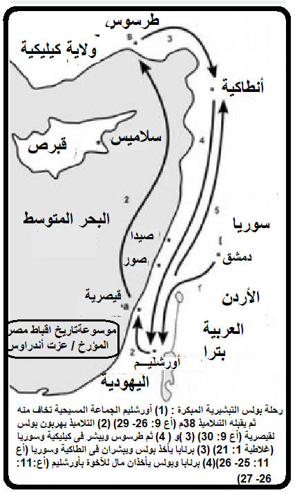 ثانيا : التفسير الحرفى والتاريخى والجغرافى - إعداد عزت اندراوس 1) " فَأَخَذَهُ بَرْنَابَا وَأَحْضَرَهُ إِلَى ٱلرُّسُلِ، وَحَدَّثَهُمْ كَيْفَ أَبْصَرَ ٱلرَّبَّ فِي ٱلطَّرِيقِ وَأَنَّهُ كَلَّمَهُ، وَكَيْفَ جَاهَرَ فِي دِمَشْقَ بِٱسْمِ يَسُوعَ" من الواضح أن ھذا كان بعد ١٨ إلى ٣٦ شھرا أى حوالى سنة 38م (غل ١ :١٥ - ٢٤ )15 ولكن لما سر الله الذي افرزني من بطن امي، ودعاني بنعمته 16 ان يعلن ابنه في لابشر به بين الامم، للوقت لم استشر لحما ودما 17 ولا صعدت الى اورشليم، الى الرسل الذين قبلي، بل انطلقت الى العربية، ثم رجعت ايضا الى دمشق. 18 ثم بعد ثلاث سنين صعدت الى اورشليم لاتعرف ببطرس، فمكثت عنده خمسة عشر يوما. 19 ولكنني لم ار غيره من الرسل الا يعقوب اخا الرب. 20 والذي اكتب به اليكم هوذا قدام الله اني لست اكذب فيه. 21 وبعد ذلك جئت الى اقاليم سورية وكيليكية. 22 ولكنني كنت غير معروف بالوجه عند كنائس اليهودية التي في المسيح. 23 غير انهم كانوا يسمعون:« ان الذي كان يضطهدنا قبلا، يبشر الان بالايمان الذي كان قبلا يتلفه». 24 فكانوا يمجدون الله في " وتظھر ھذه الآية مستوى الشكوكية الذي كان ينظر الجماعة المسيحية فى الكنيسة الأولى في أورشليم إلى مضطھديھم السابقين. م ن الواضح أن أعمال الرسل يدون عدة زيارات لبولس إلى أورشليم بعد اھتدائه الدراماتيكي. ١ - الزيارة الأولى لأورشليم (أع 9: 26) «وَلَمَّا جَاءَ شَاوُلُ إِلَى أُورُشَلِيمَ حَاوَلَ أَنْ يَلْتَصِقَ بِٱلتَّلاَمِيذِ، وَكَانَ ٱلْجَمِيعُ يَخَافُونَهُ غَيْرَ مُصَدِّقِينَ أَنَّهُ تِلْمِيذٌ». ٢ - زيارة الإرتياح والتعزية (أع ١١ :٣٠) 30 ففعلوا ذلك مرسلين الى المشايخ بيد برنابا وشاول. " ٣ - ،بعد رحلته التبشيرية (أع ١٢ :٢٥) 25 ورجع برنابا وشاول من اورشليم بعد ما كملا الخدمة، واخذا معهما يوحنا الملقب مرقس. ٤ - أورشليم مجمع (أع 15: 1- 2 )1 وانحدر قوم من اليهودية، وجعلوا يعلمون الاخوة انه «ان لم تختتنوا حسب عادة موسى، لا يمكنكم ان تخلصوا». 2 فلما حصل لبولس وبرنابا منازعة ومباحثة ليست بقليلة معهم، رتبوا ان يصعد بولس وبرنابا واناس اخرون منهم الى الرسل والمشايخ الى اورشليم من اجل هذه المسالة. " عقد هذا المجمع سنة 50 و51 م.... كان أول مجمع كنسي يعقد ويعتبر نواة للمجامع الكنسية التي عقدت بعهده، وإن اختلفت عنها كثيرًا... ٥ - ،زيارة قصيرة إلى الكنيسة (أع ١٨ :٢٢) 22 ولما نزل في قيصرية صعد وسلم على الكنيسة، ثم انحدر الى انطاكية. ٦ -،زيارة مع يعقوب والشيوخ وما نتج عنه من يمين القسم وإلقاء القبض عليه ( أع ٢١ :١٧) 17 ولما وصلنا الى اورشليم قبلنا الاخوة بفرح. " *** بَرْنَابَا اسم أرامي معناه "ابن الوعظ" أو " إبن العزاء" وهو لاوي قبرصي الجنس. اعتنق المسيحية في زمان الرسل. فترك علاقاته العالمية وابتدأ يجاهد في نشر بُشْرَى الخلاص في العالم، ويحث الناس على اعتناق المسيحية، ويعزّيهم في مصائبهم. ولذلك سماه الرسل برنابا أي "ابن الوعظ" بعدما كان اسمه أولًا يوسف ذُكر في (أع ٤: ٣٦ و٣٧) 36 ويوسف الذي دعي من الرسل برنابا، الذي يترجم ابن الوعظ، وهو لاوي قبرسي الجنس، 37 اذ كان له حقل باعه، واتى بالدراهم ووضعها عند ارجل الرسل " ونلاحظ أن الرسل اعطوه إسما جديدا كما يفعل كهنة الأقباط بإهطاء إسم جديد بعد معمودية الأطفال ومسحهم بالروح القدس ةقد أعطى الرسل غسما لشاول وصار بولس وإسما جديدا ليوسف ليصير برنابا وأصبح برنابا شخصية مرموقة فى إنتشار الخدمة إلى أنطاكيةوهو الذى سيرسله الرسل فى (أع 11: 22- 24) 22 فسمع الخبر عنهم في اذان الكنيسة التي في اورشليم، فارسلوا برنابا لكي يجتاز الى انطاكية. 23 الذي لما اتى وراى نعمة الله فرح، ووعظ الجميع ان يثبتوا في الرب بعزم القلب 24 لانه كان رجلا صالحا وممتلئا من الروح القدس والايمان. فانضم الى الرب جمع غفير." لكى يرعى المسيحية الجديدة التى دخلت هناك بإعتناق اليونانيين المسيحية بتبشير بولس وتبشير المسيحيين الذين تشتتوا بعد الإضطهاد بعد إستشهادد إسطفانوس وهذا عرف شاول وخلوصه بطريق ما وعرّف سائر التل